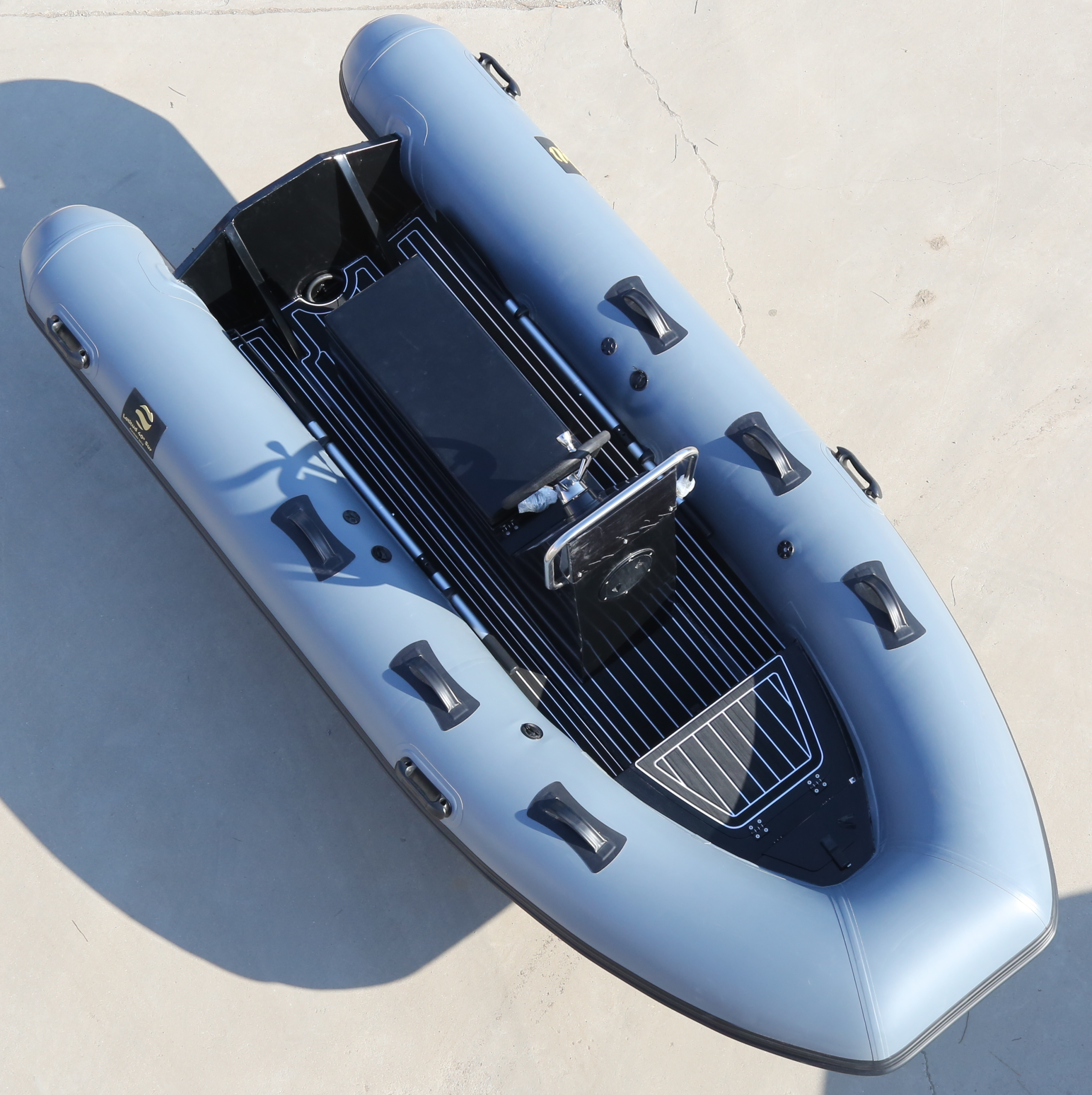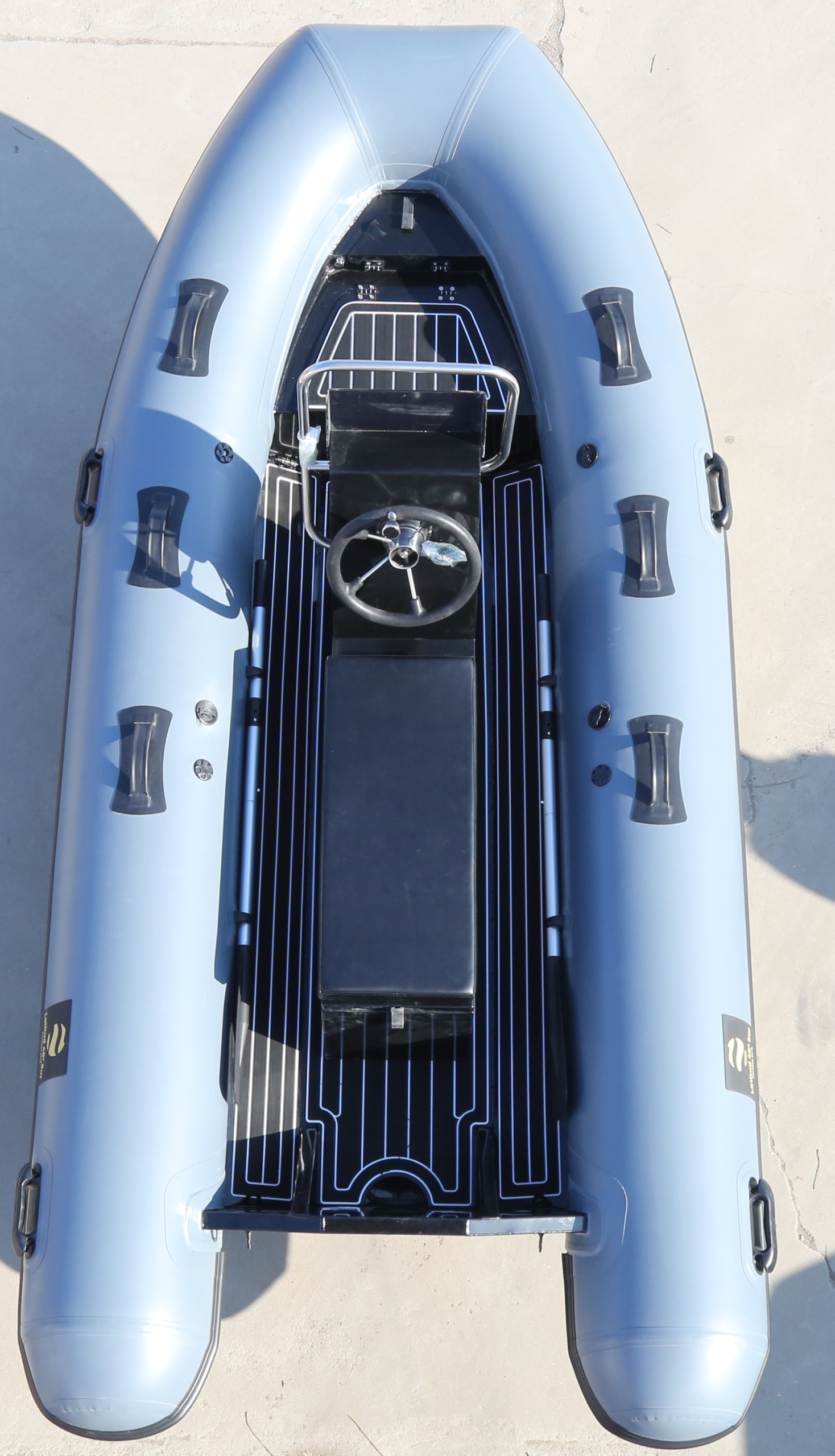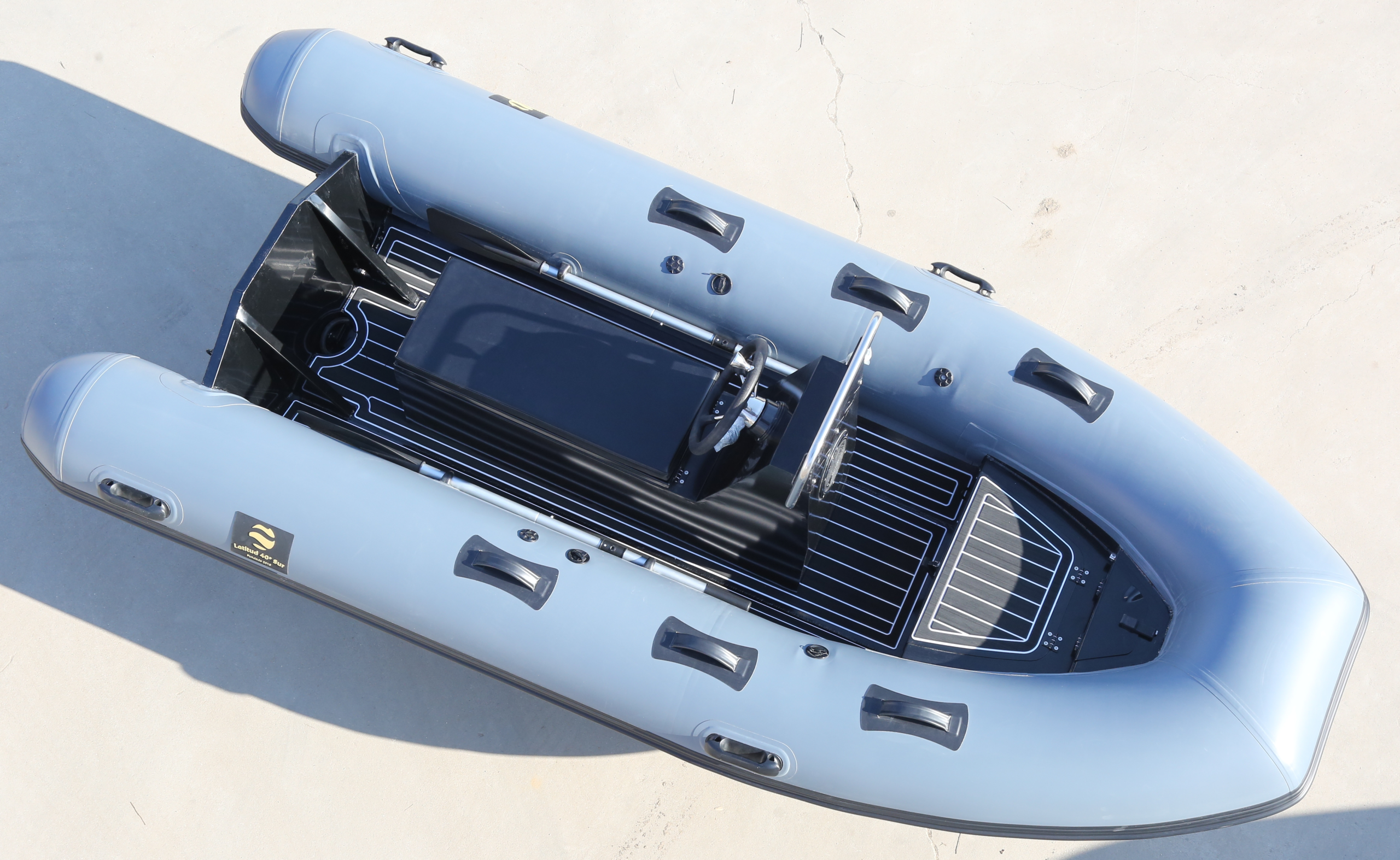 Bote Inflable de quilla rígida de 3,6 metros de eslora (12 pies). Tubulares de 45cm de diámetro en Hypalon (Orca 828 de Pennel & Flipo) con tres cámaras y tres válvulas de sobrepresión. Casco de aluminio en pintura negra electrostática. Cubierta en imitación Teka de EVA. Tanque interno de 6 galones en cajón de proa con medidor eléctrico. Silla Jockey para dos personas. Consola central. Timón en acero inoxidable. Agarraderas en consola en acero inoxidable. Categoría Diseño «C». Carga máxima: 5 personas (650kg)